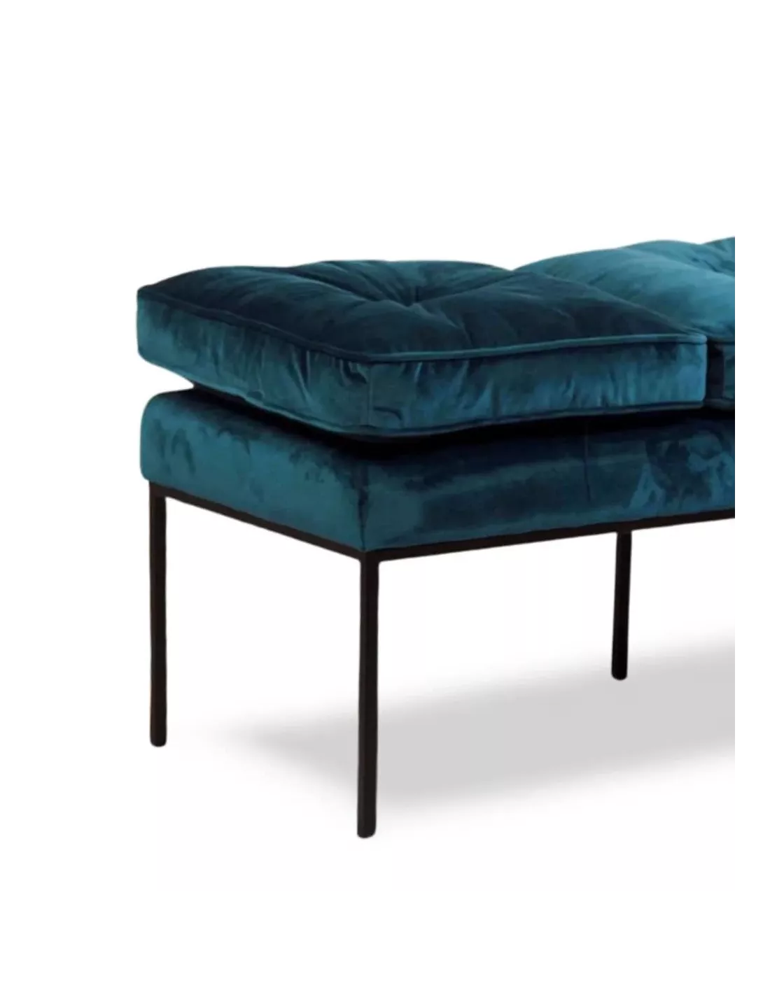 Cette banquette bleu en velours est un joli mélange de matières. Elle est conçue en acier de couleur noire et d’une assise garnie de mousse polyuréthane pour une assise moelleuse et confortable, recouvert d’un velours de couleur bleu.