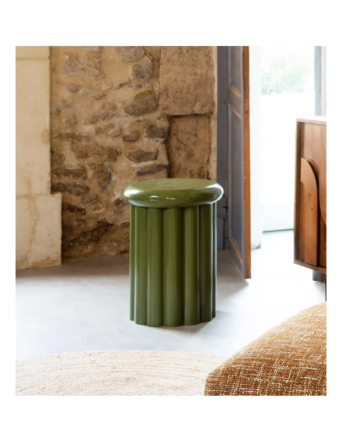 Le bout de canapé vert olive brillant est une pièce élégante et polyvalente qui apportera une touche de sophistication à votre espace de vie. Avec des dimensions de D34 x H46 cm, il est idéal pour compléter votre salon ou votre chambre.