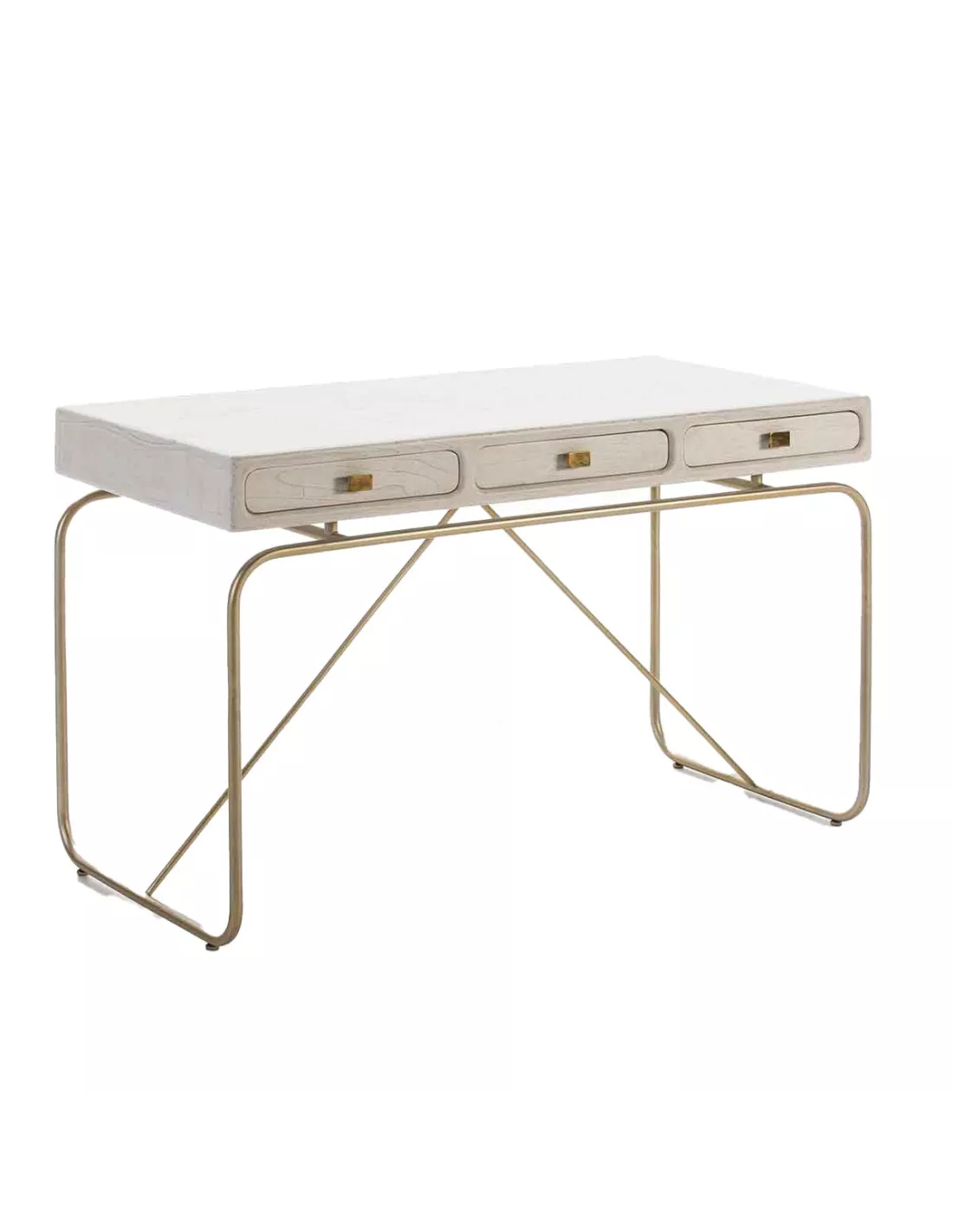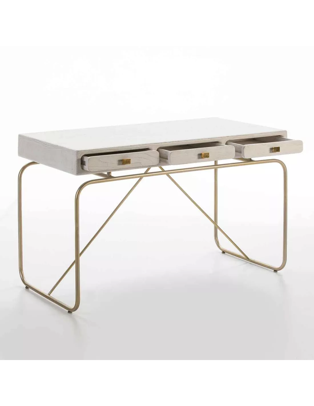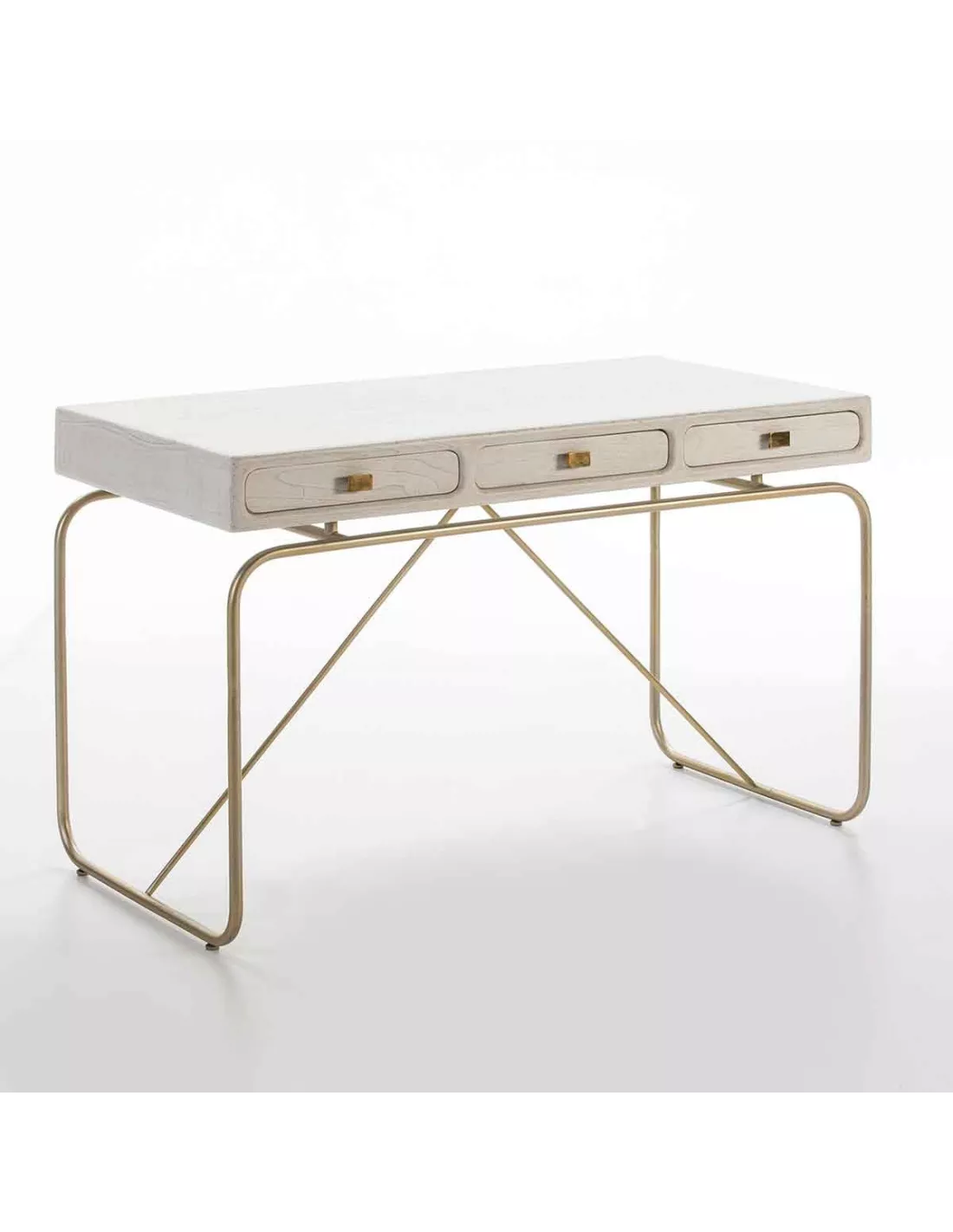 Bureau 3 tiroirs en bois blanc patiné et métal doré, Thai Natura