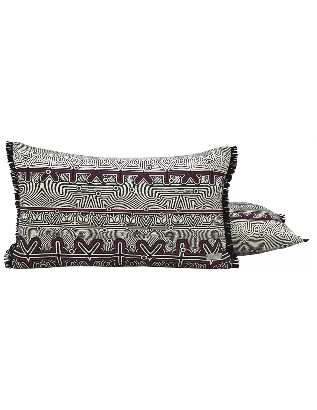 Coussin rectangulaire noir et fuschia à franges illustrant un labyrinthe, Jean Paul Gaultier