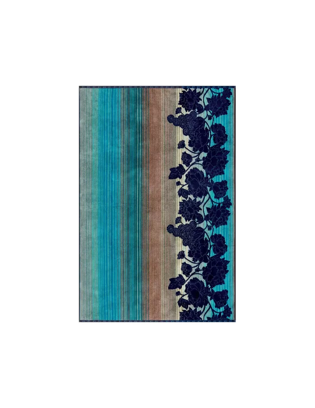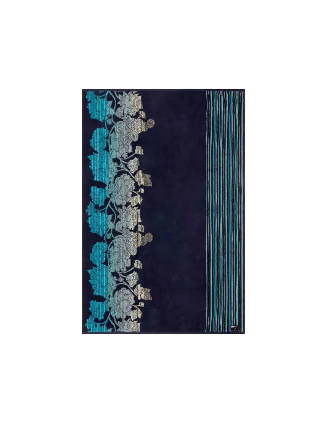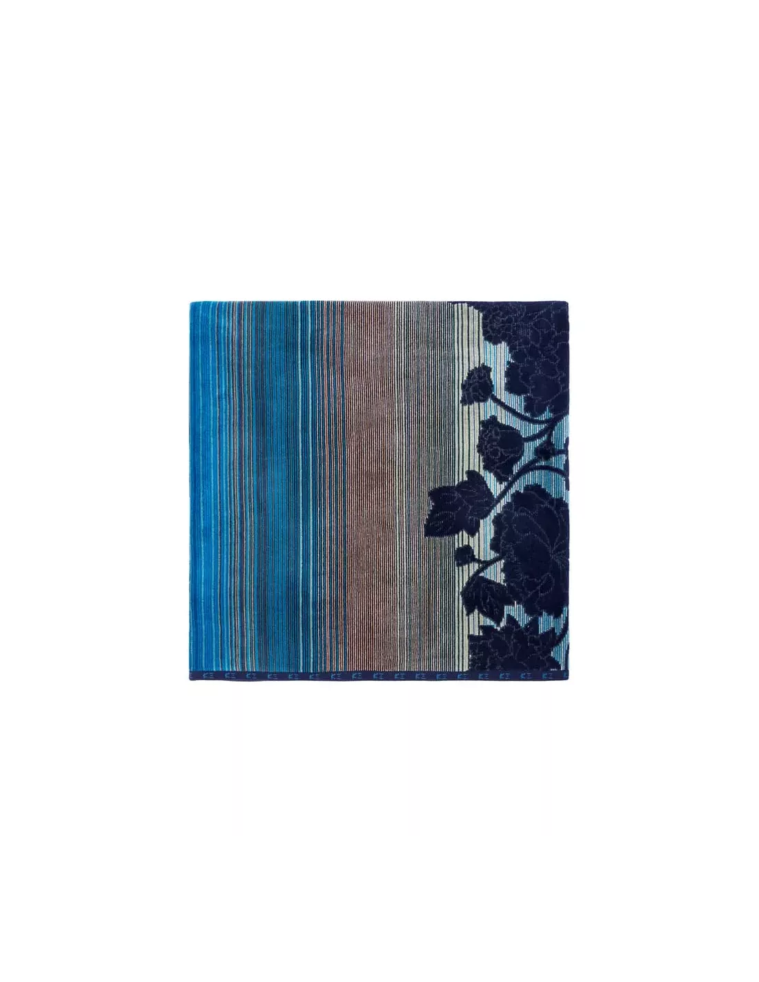 Inspiré par les pivoines, fleurs emblématiques de la culture japonaise, Kenzo Takada a créé une composition où se mêlent avec grâce rayures et grandes fleurs. Les pétales généreux, aux nuances de bleus, semblent s’épanouir sur le fond rayé, apportant une dimension à la fois graphique et organique.