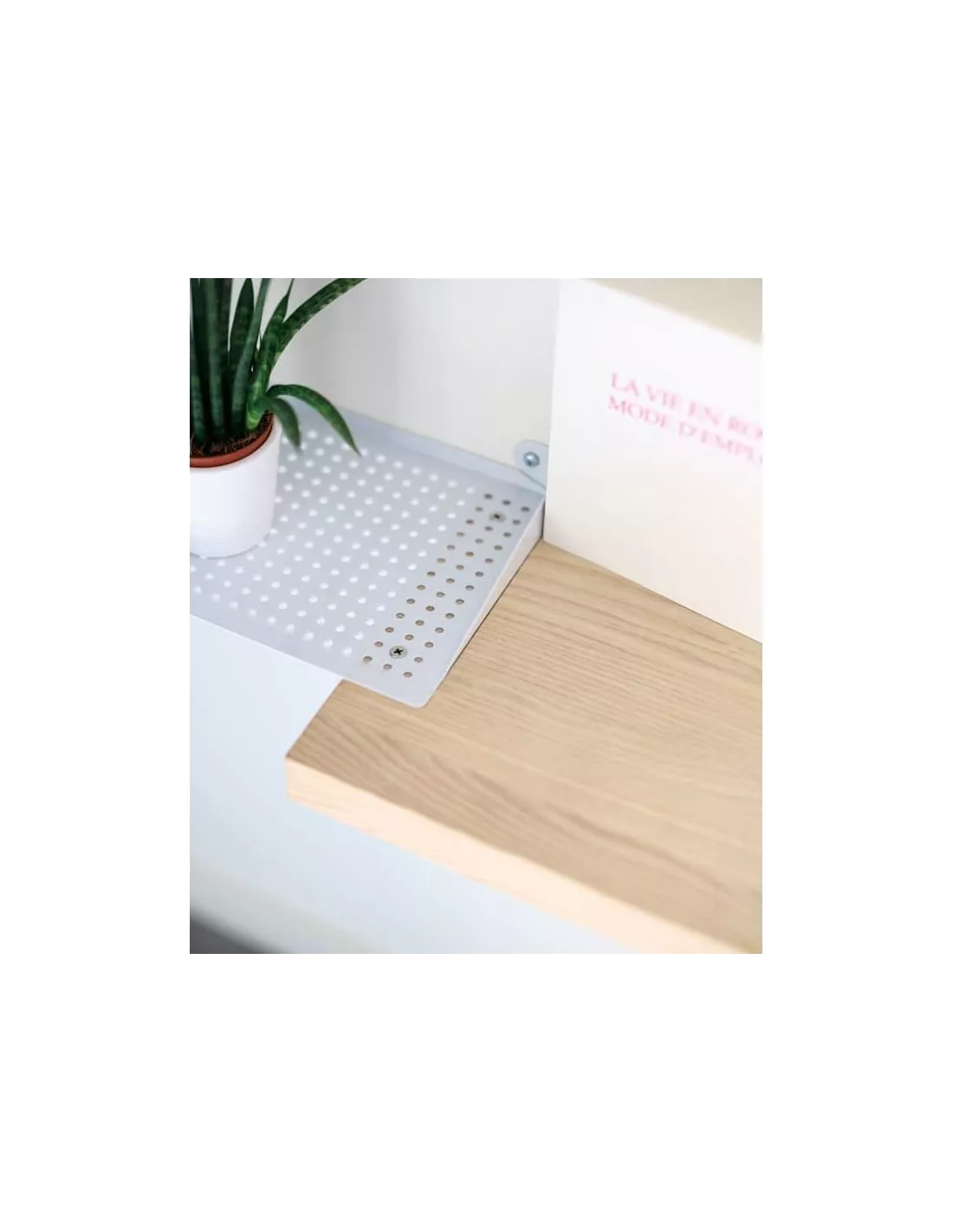 L’étagère se fixe au mur avec 2 chevilles pour la partie métallique et une cheville invisible pour la partie en bois. Les chevilles sont fournis avec une notice de montage.
