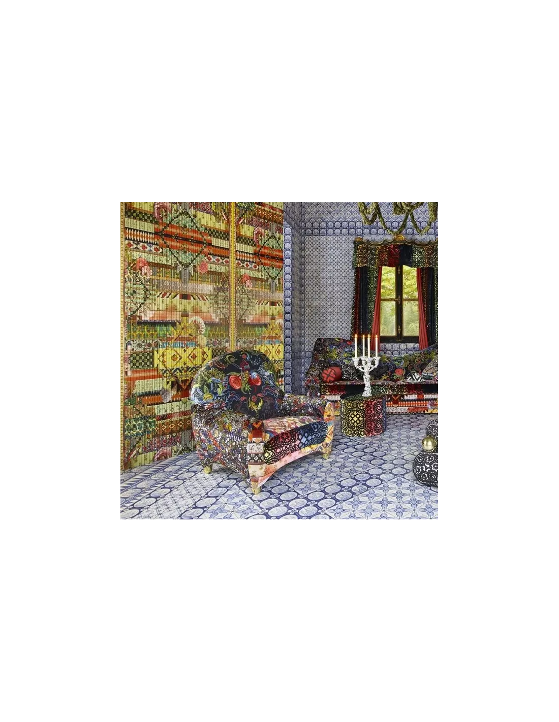Panneau décoratif issu de la collection Au Théâtre Ce Soir de Christian Lacroix, Fetiche est un pèle-mêle éclectique d’images mélangeant des imprimés vintage à des motifs aztèques d’Amérique du sud. L’impression est réalisée sur un luxueux support intissé, ce qui rend la pose du panneau plus facile. La colle doit être appliquée sur le mur.