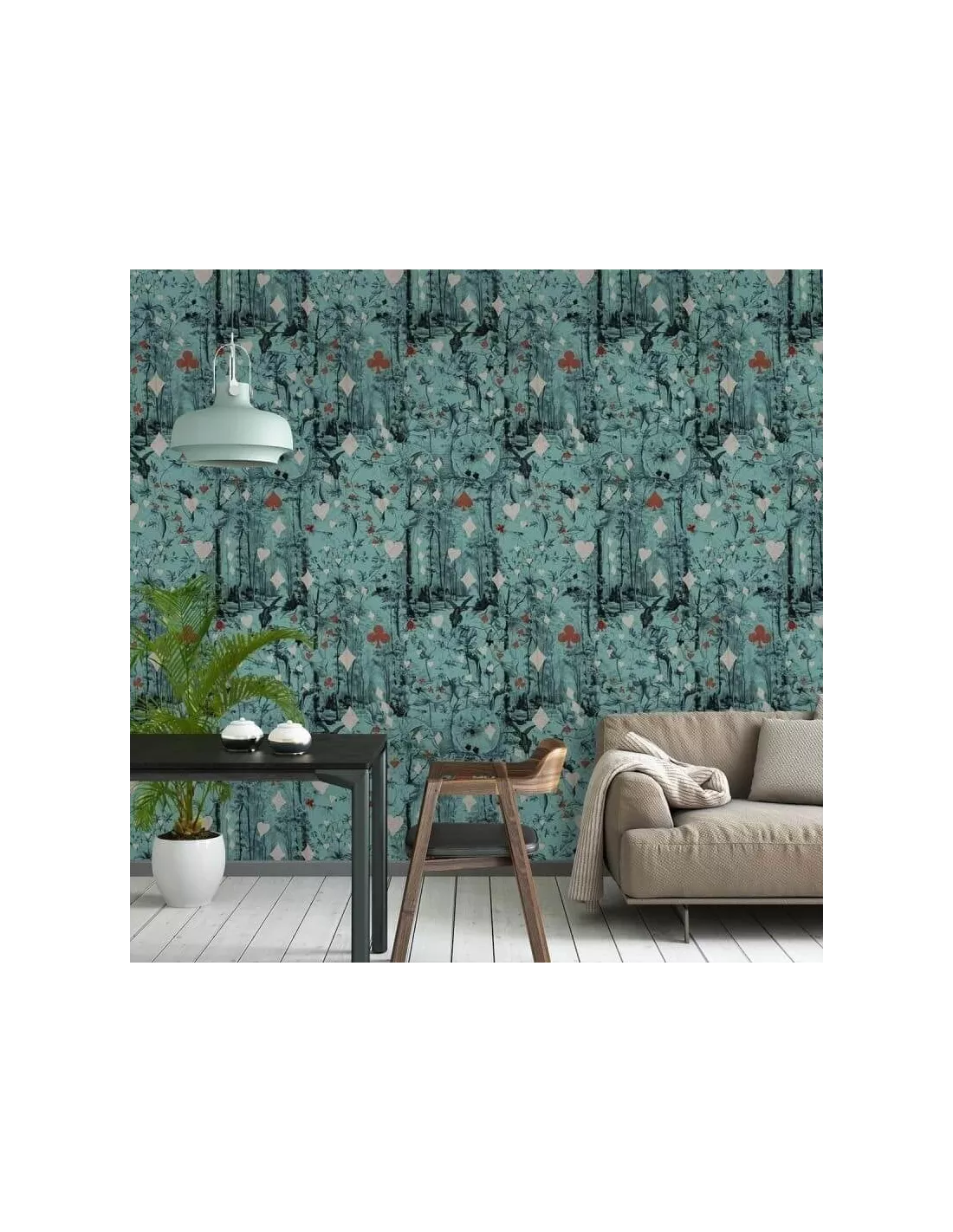 Avec Beriba Céladon, Jean Paul Gaultier présente un paysage fantastique. À la manière d’une gravure, ce papier peint dessine des animaux dans une forêt enchantée. Les différents symboles des cartes à jouer recouvrent l’ensemble et apportent des touches de couleurs. Ce papier peint possède un support intissé, ce qui rend sa pose plus facile. La colle doit être appliquée sur le mur. Ce papier peint Jean Paul Gaultier est édité par la maison Lelièvre.