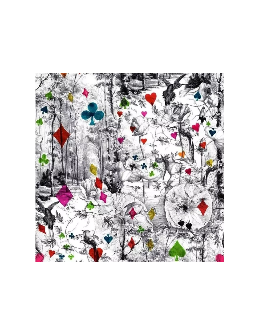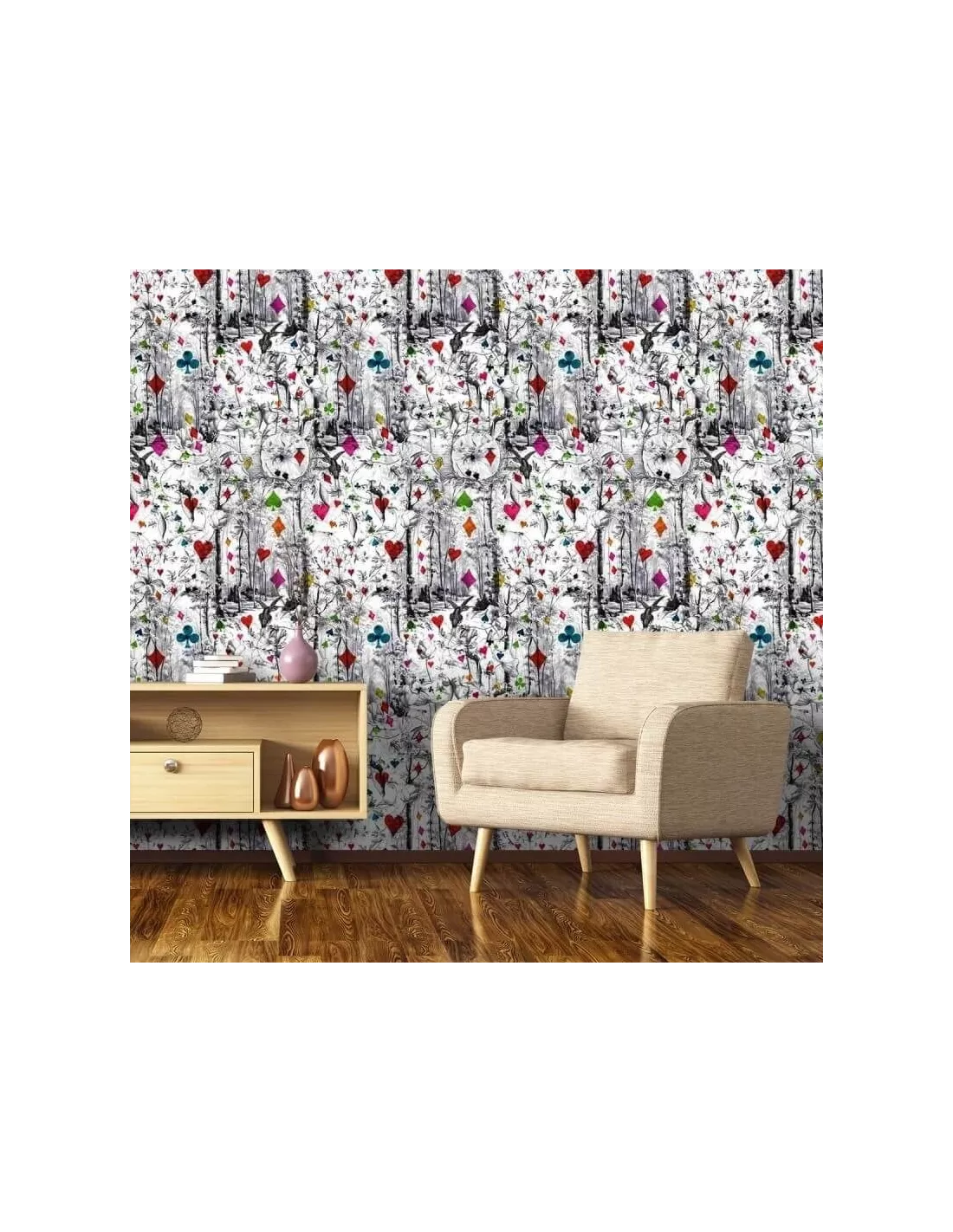 Avec Beriba Multico, Jean Paul Gaultier présente un paysage fantastique. À la manière d’une gravure, ce papier peint dessine des animaux dans une forêt enchantée. Les différents symboles des cartes à jouer recouvrent l’ensemble et apportent des touches de couleurs. Ce papier peint possède un support intissé, ce qui rend sa pose plus facile. La colle doit être appliquée sur le mur. Ce papier peint Jean Paul Gaultier est édité par la maison Lelièvre.