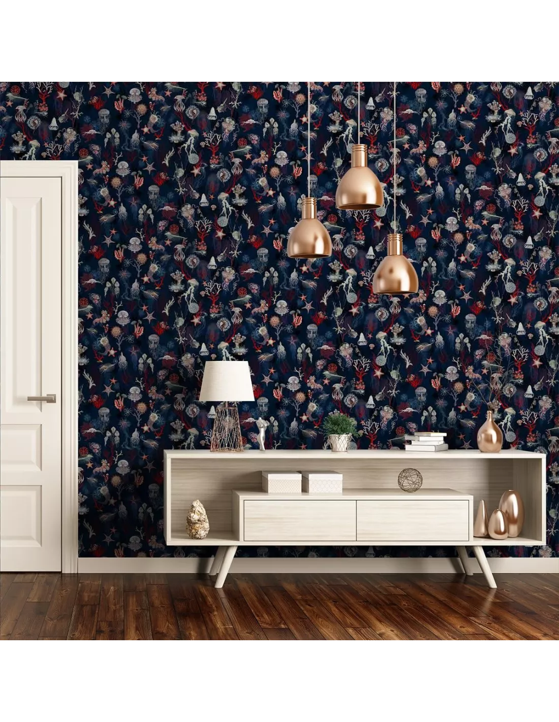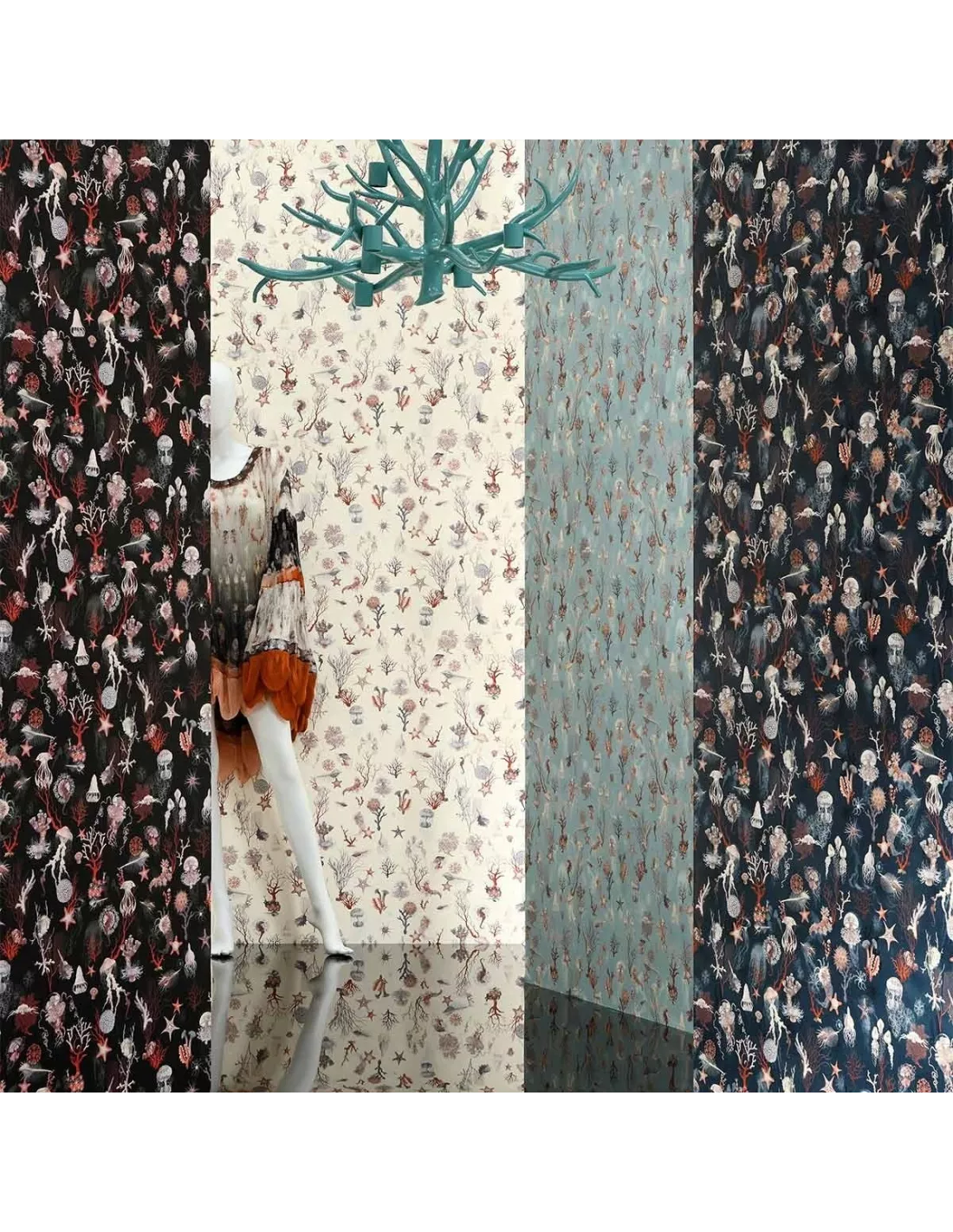 Le papier peint Corail Marine Jean Paul Gaultier est un papier peint vinyle au thème aquatique qui arbore une large variété de plantes et de créatures habitant les fonds océaniques. Hippocampes et méduses s’y côtoient au milieu d’une végétation sous-marine. Le motif est complété en arrière-plan par des silhouettes d’animaux marins. Ce papier peint possède un support intissé, ce qui rend sa pose plus facile. La colle doit être appliquée sur le mur. Ce papier peint Jean Paul Gaultier est édité par la maison Lelièvre.