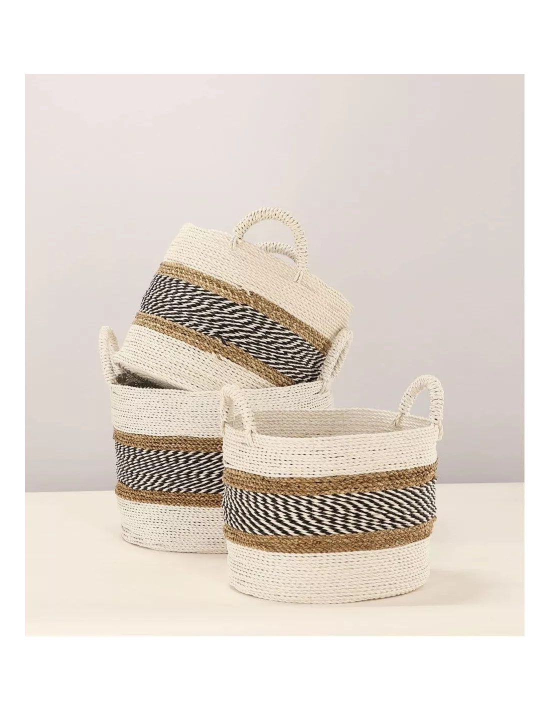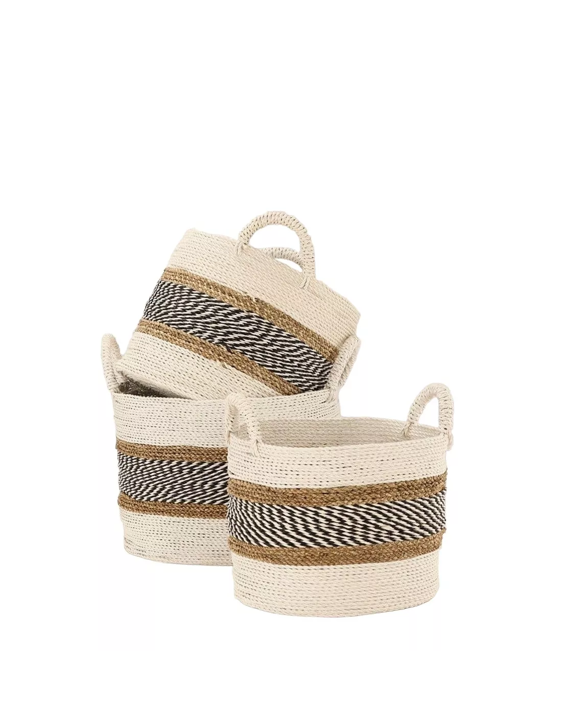 Ce set paniers en raphia naturel vous séduira avec son style déco ethnique chic ou bien bord de mer. A l’intérieur d’une chambre, d’une entrée ou d’un salon, il donnera un style tendance à votre pièce. La structure en raphia et herbier marin fait de ces paniers des éléments de déco aussi durables que naturels. On aime aussi les petits détails tels que la qualité de fabrication et le côté pratique pour le rangement. Les dimensions s’échelonnent entre 30 et 45cm de diamètre et entre 30 et 35cm de hauteur.