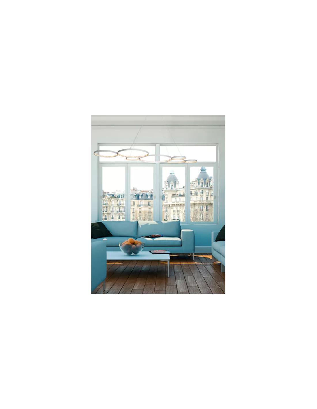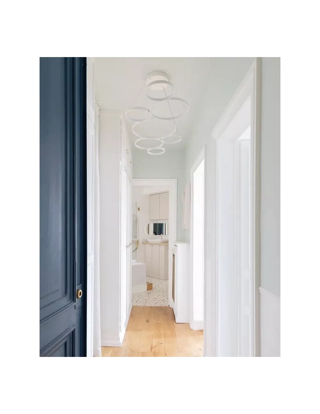 La suspension Ultra 8 blanche Le Deun Luminaires, est une très belle suspension générant une lumière directe et indirecte. Les 7 cercles de ce lustre sont en acier recouverts de peinture Epoxy blanche, donc très résistante. La suspension Ultra 8 blanche est composée de 336 LED blancs chauds (3696 lumens) incrustés. Cette suspension design est équipée d’un transformateur électronique de 110/220 volts, muni d’une télécommande avec variateur de puissance 0 à 100 %. La suspension Ultra 8 blanche vous est également proposée finition noire.