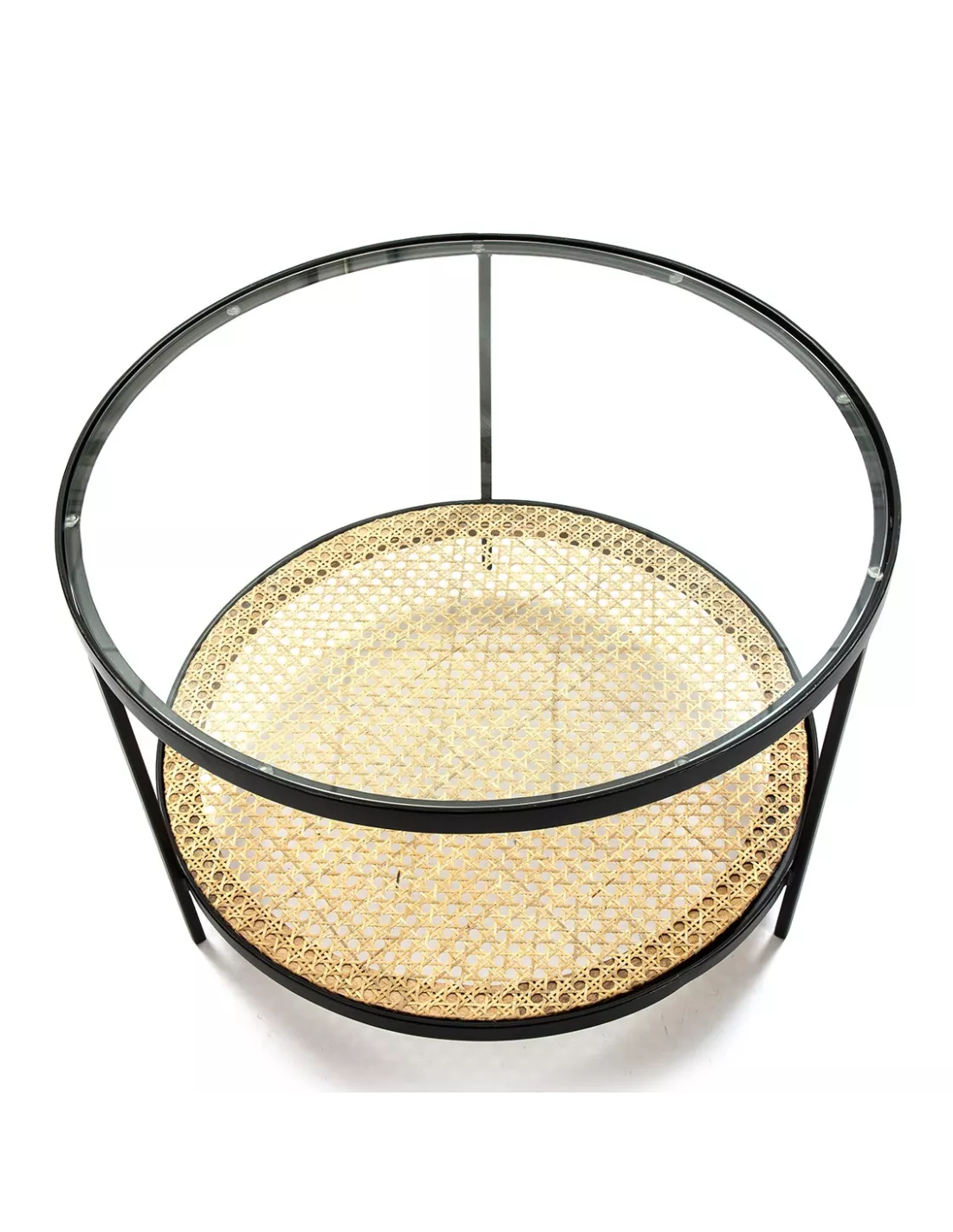 Table basse/sellette ronde en verre, rotin et métal noir, Thai Natura