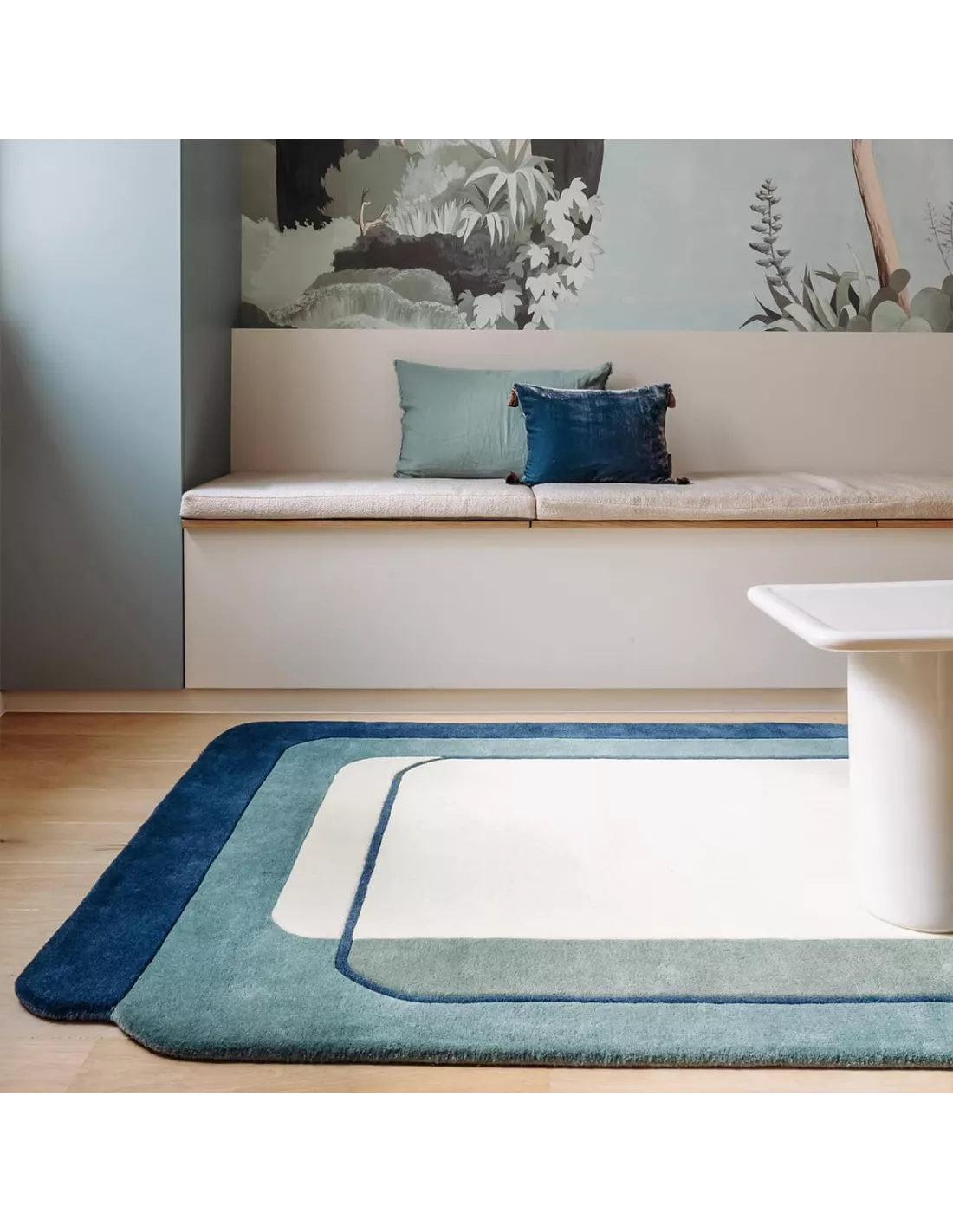 Tapis design au fond blanc cassé et aux motifs de bleu, Edito