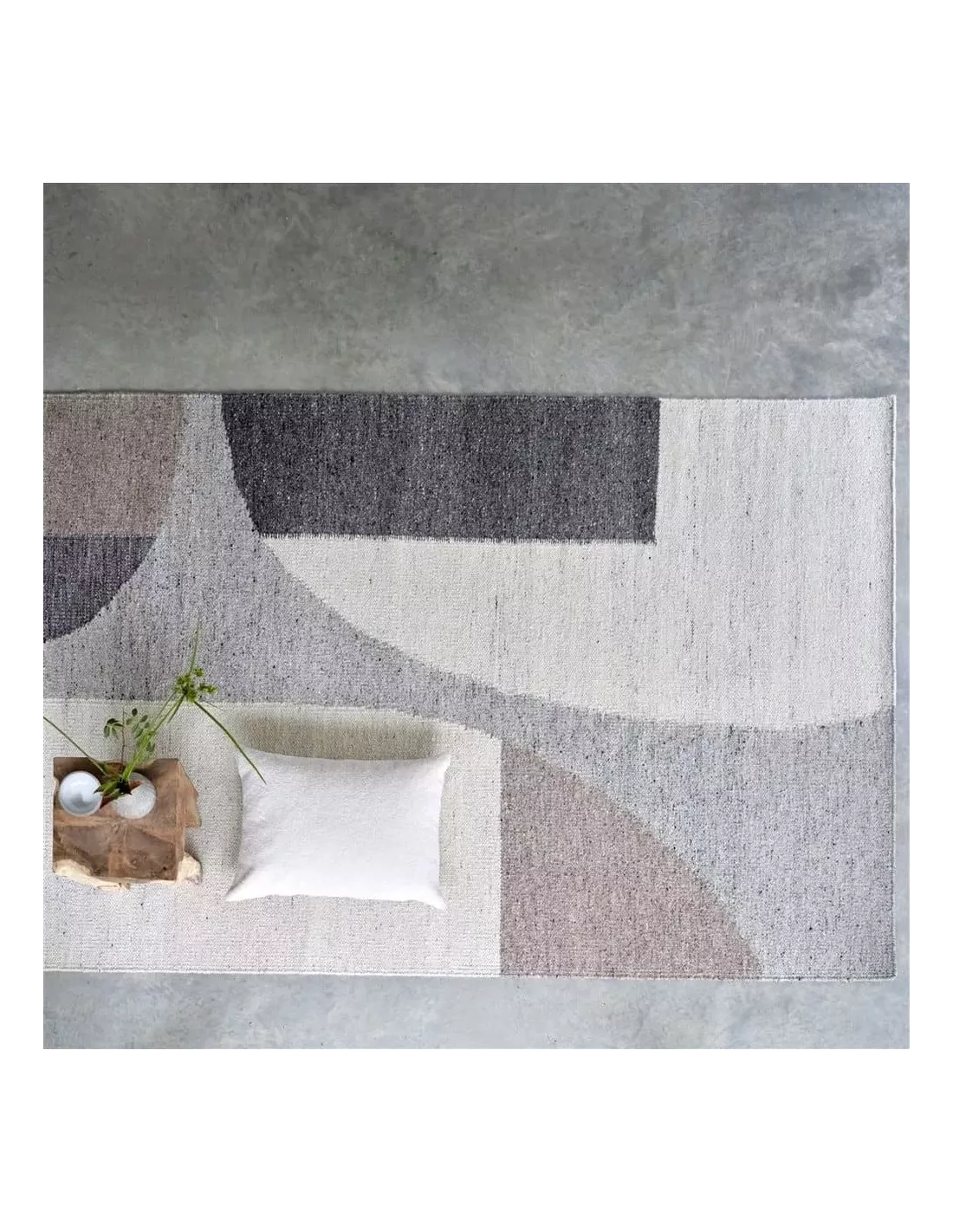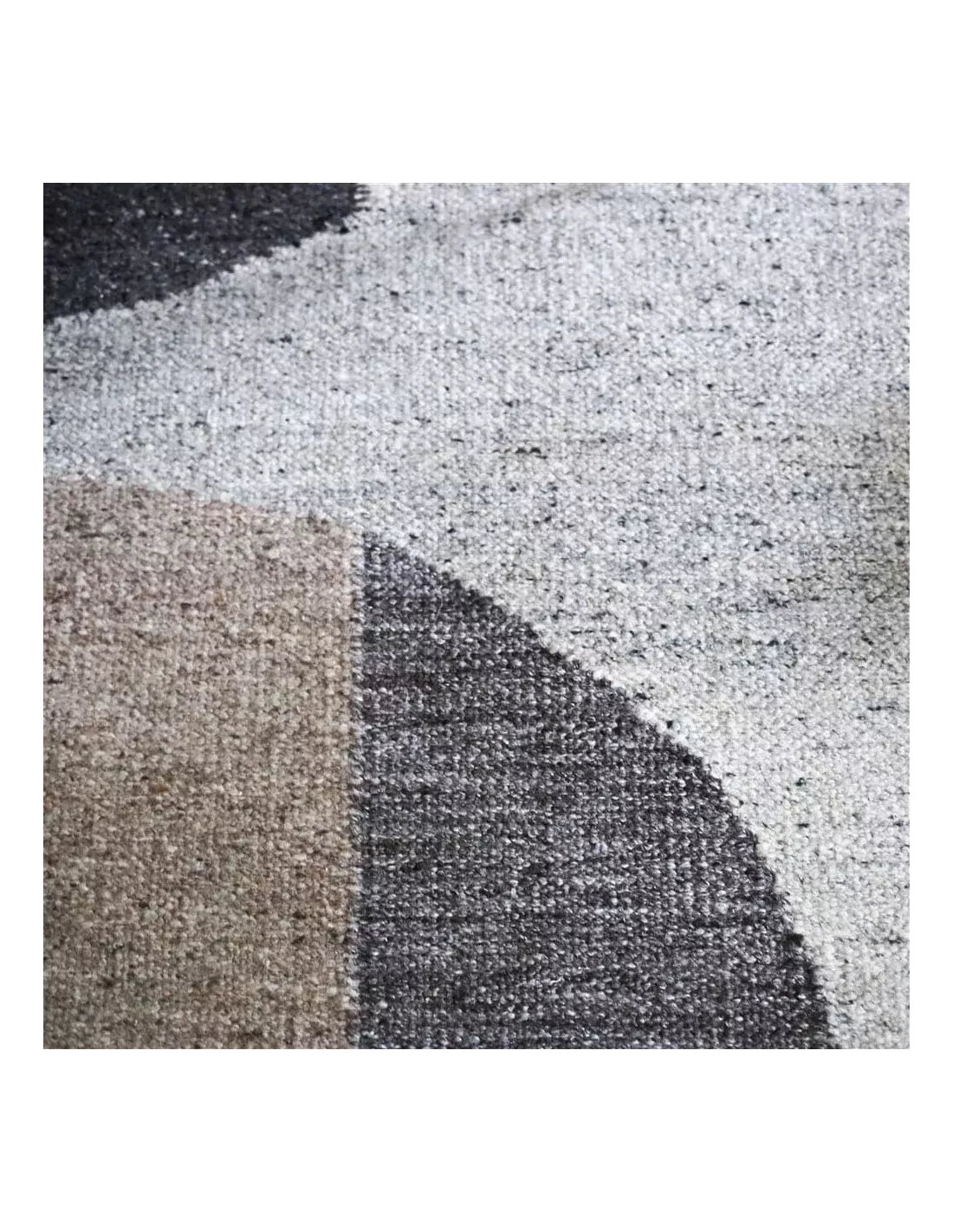 Au-delà de ses qualités techniques, ce tapis possède une véritable dimension artistique. Les formes géométriques qui le composent, délicatement agencées, créent une composition visuelle épurée et harmonieuse. La palette de gris, de beiges et de blancs confère à l’ensemble une élégance sophistiquée, tout en douceur.
