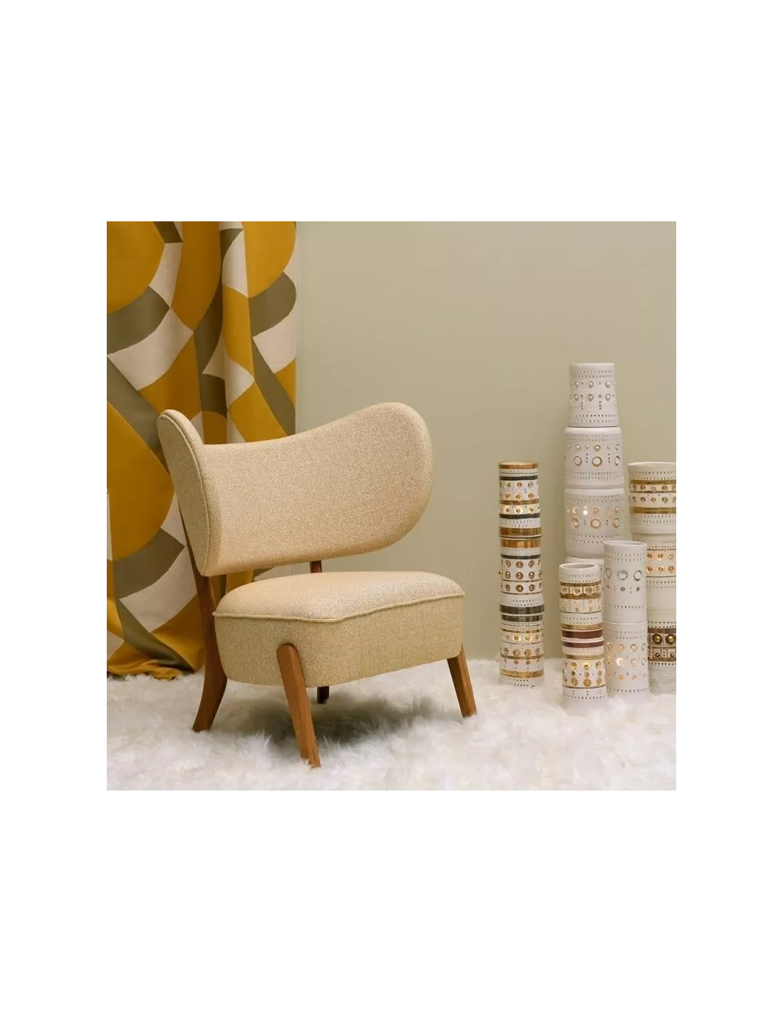 Réinterprétant les coiffes traditionnelles des moines tibétains, le tissu Dalaï Soleil est un lampas mettant en avant des formes géométriques. Le travail des armures souligne les contrastes de ce design, ce qui accorde un rendu graphique et contemporain. Ce textile, au dessin emblématique de la collection Himalaya de Lelièvre, est composé majoritairement de coton.