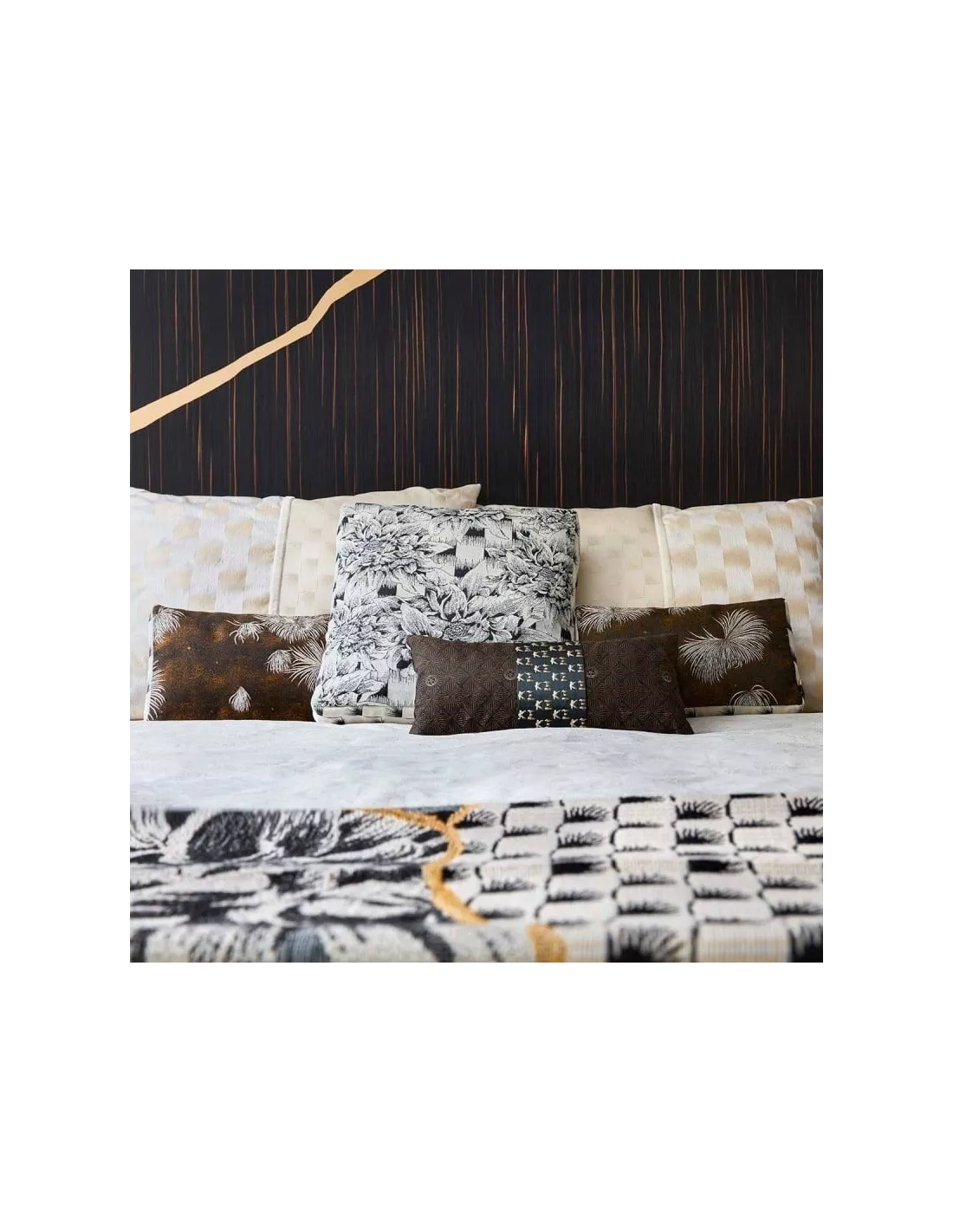 Kenzo présente un motif abstrait de couleurs douces et sombres à travers le jacquard Kiku Awase noir. Il met en avant des figures qui évoquent des lis-araignées blancs. Ce design tracé avec des traits curvilignes apporte une note d’élégance aux intérieurs. Ces choix de teintes mettent l’accent sur le tissage de ce jacquard.
