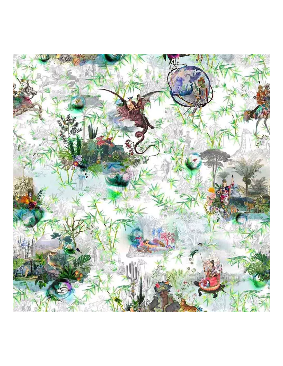 Le tissu Reveries Vert Buis Christian Lacroix vous fait voyager dans le monde des rêves de la maison Lacroix avec cet imprimé éclectique. Sur une toile pas conventionnelle, des créatures mythiques parcourent un royaume magique. Ce dessin surprenant est imprimé en numérique sur un coton robuste.