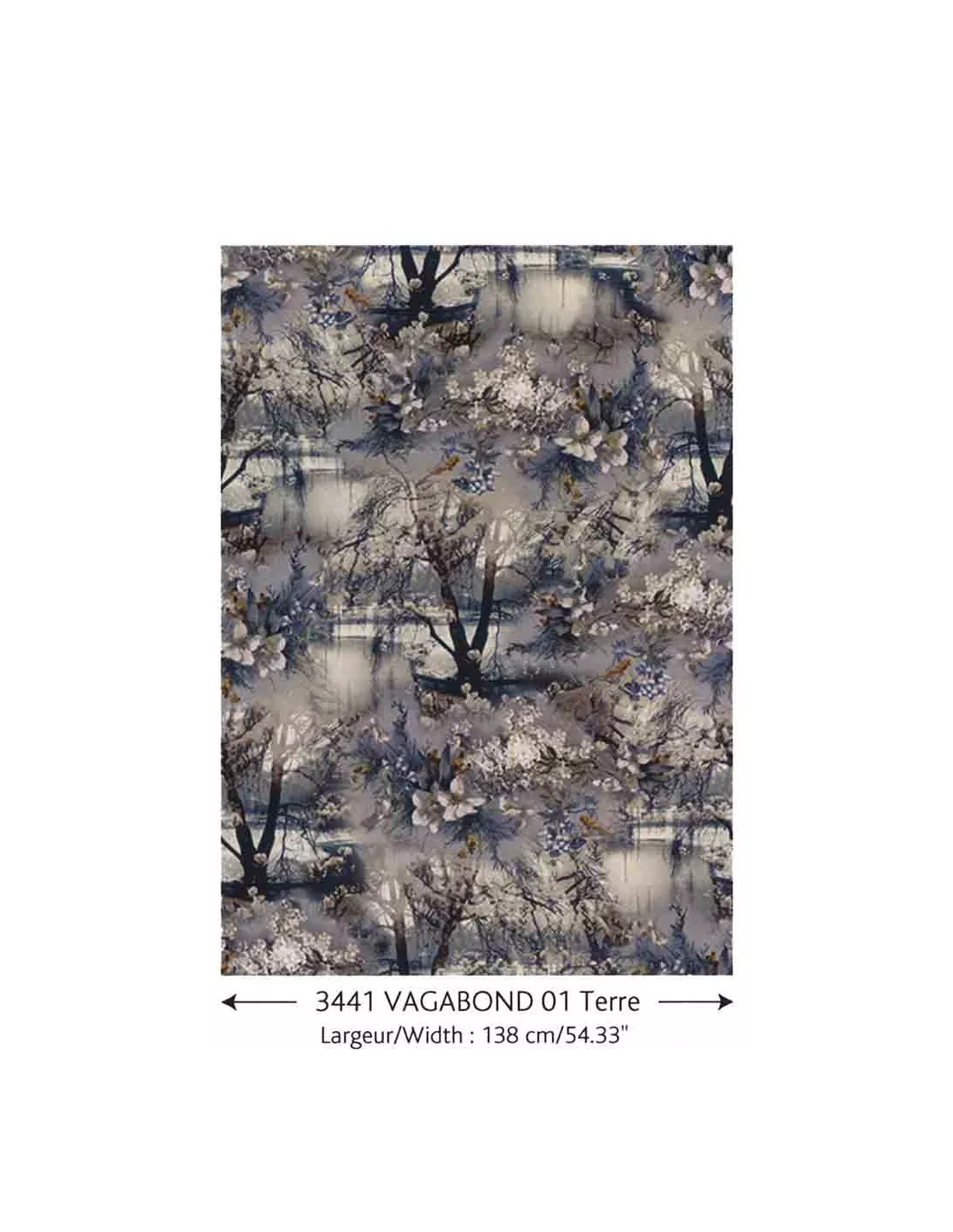Le tissu Vagabond Terre Jean Paul Gaultier est une impression numérique sur un lin souple. Il est le support d’une expression photographique surdimensionnée. Vagabond déploit l’élégant flouté d’un paysage endormi en camaïeux délavés. Une palette de fond noir, indigo ou sépia et des décors neutres. Ce tissu d’ameublement est lavable à 40°.